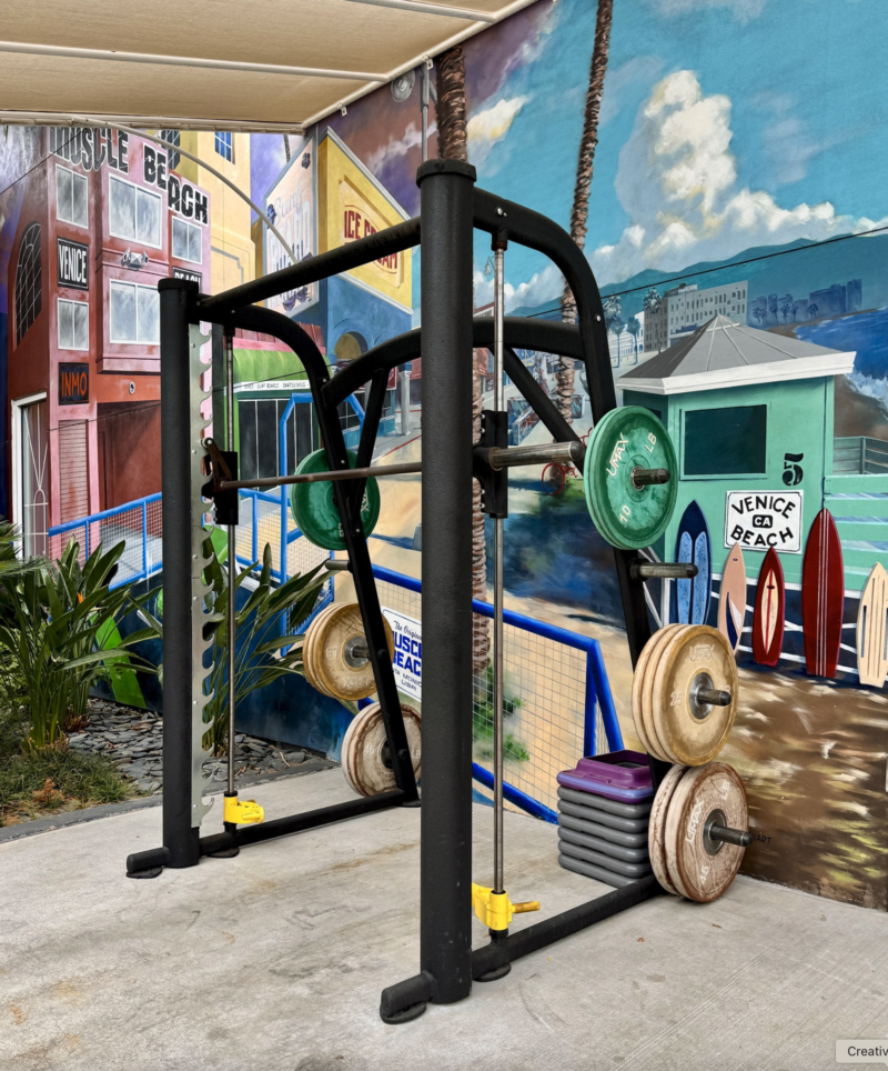 A vibrant slice of Venice Beach, featuring a stunning mural by a local artist that sets the scene for your workout. This private space located outside next to the track is equipped with a bench press, Smith machine, rhino-coated kettlebells, rope climb, and climbing rigs—perfect for strength training with a touch of seaside flair. Shirts optional.
