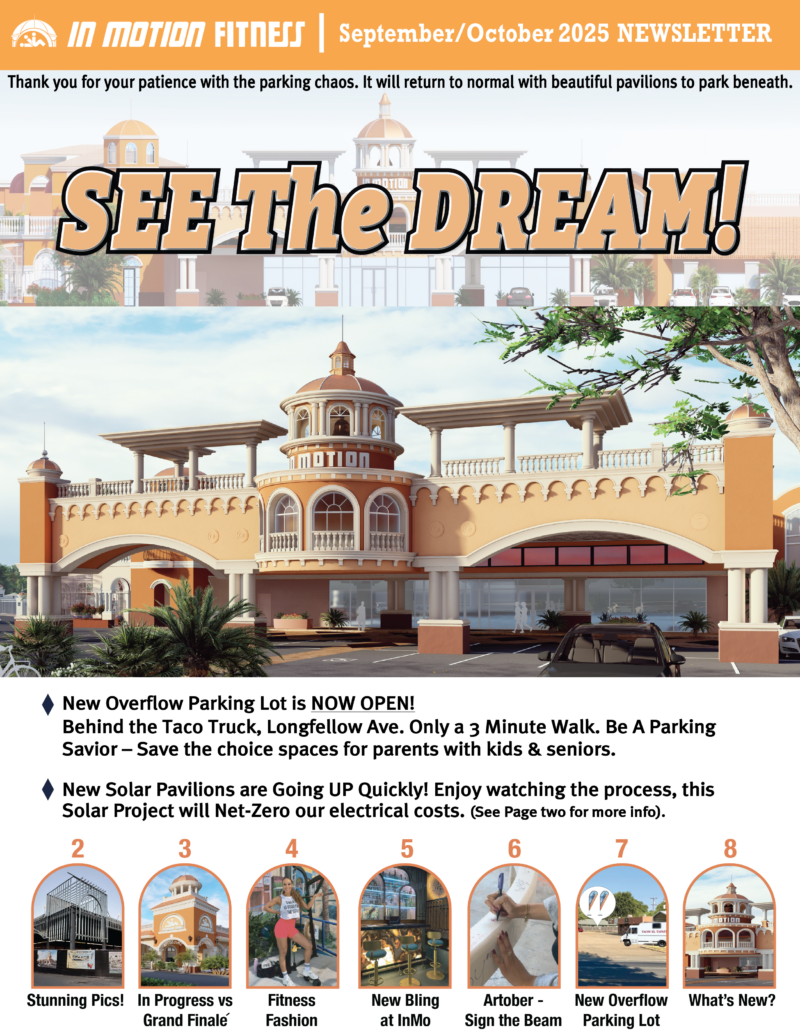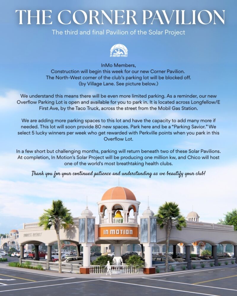 InMo Members, Construction will begin this week for our new Corner Pavilion. The North-West corner of the club’s parking lot will be blocked off. (by Village Lane. See picture below.) We understand this means there will be even more limited parking. As a reminder, our new Overflow Parking Lot is open and available for you to park in. It is located across Longfellow/E First Ave, by the Taco Truck, across the street from the Mobil Gas Station. We are adding more parking spaces to this lot and have the capacity to add many more if needed. This lot will soon provide 80 new spaces. Park here and be a “Parking Savior.” We select 5 lucky winners per week who get rewarded with Perkville points when you park in this Overflow Lot. In a few short but challenging months, parking will return beneath two of these Solar Pavilions. At completion, In Motion’s Solar Project will be producing one million kw, and Chico will host one of the world's most breathtaking health clubs. Thank you for your continued patience and understanding as we beautify your club!